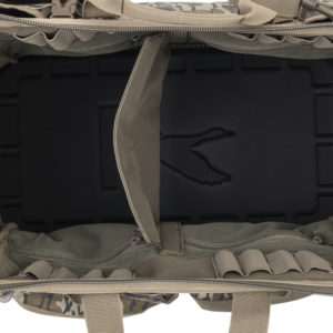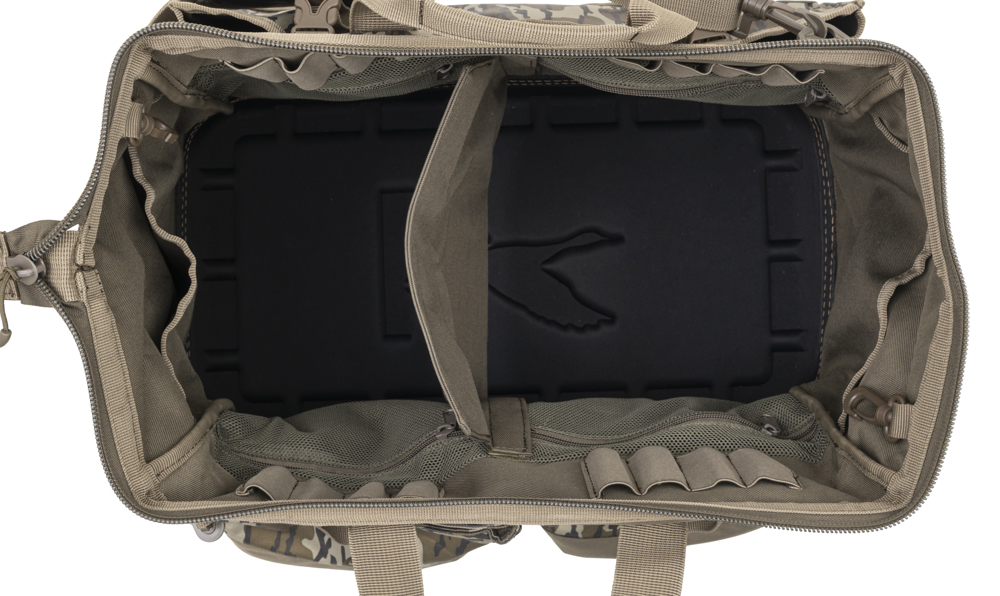 Die Pit Blind Bag hat ein großes, offenes Hauptfach mit einer herausnehmbaren Trennwand zur individuellen Gestaltung des Inhalts. Zusätzliche Innentaschen halten kleinere Gegenstände getrennt und in Reichweite. An der Außenseite hat die Pit Blind Bag zwei aufklappbare Taschen. Diese sind dazu gedacht, verschiedene Patronen geordnet und schnell zugänglich zu halten, wenn Sie zwischen verschiedenen Schussladungen wechseln. Außerdem gibt es eine extragroße Außentasche für einen Thermotrinkhalter oder als zusätzlichen Stauraum für Ihre Ausrüstung. Zwei eingenähte Griffe flankieren den stabilen Reißverschluss an der Oberseite, während ein abnehmbarer, verstellbarer und gepolsterter Schultergurt ein freihändiges Tragen ermöglicht. Die wichtigsten Merkmale werden durch einen wasserdichten, vorgeformten Boden vervollständigt, der für zusätzlichen Halt und Schutz des Inhalts sorgt, wenn die Tasche auf nassen Oberflächen steht. Das Hauptfach bietet einfachen Zugriff auf die Ausrüstung Das Hauptfach verfügt über eine herausnehmbare Trennwand und weitere Fächer, um Ihre Ausrüstung zu organisieren Zwei Außenfächer sind ideal für verschiedene Shells.