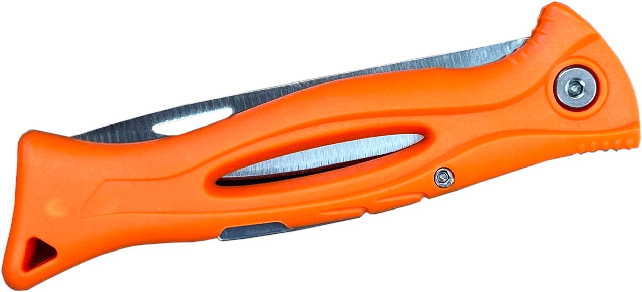 Klappmesser orange 12,5cm Griff, 9cm Klinge, Material 420SS+PP. Gesamtlänge 22 cm mit zurückklappbarem Schutz