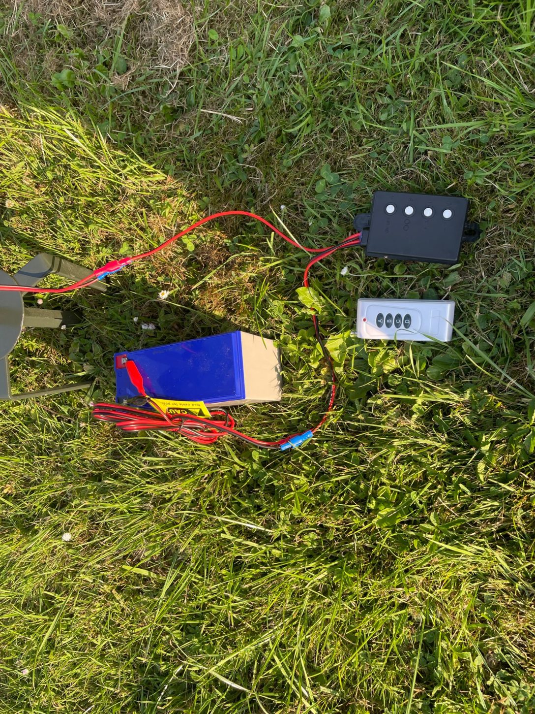 Als Batterie empfehlen wir eine 12V 12 Ampere Batterie. Damit kann die Taubenmühle 5 bis 6 Stunden lang betrieben werden.